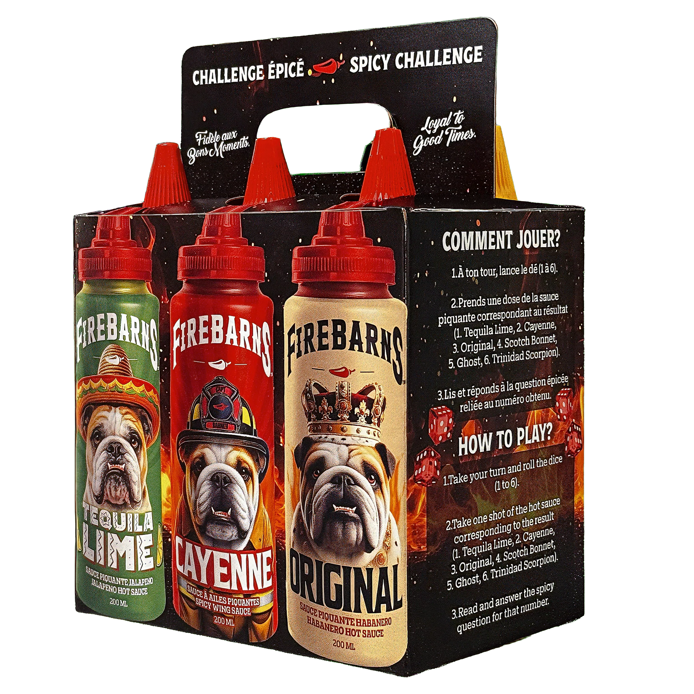 Dive into the Firebarns Spicy Challenge! This box contains a selection of hot sauces ranging from 2/10 to 9/10, along with a dice and a playing card. Roll the dice, take on the challenges, and turn up the heat with every bite. Perfect for spicing up evenings with friends or family and a memorable gift for thrill-seekers!